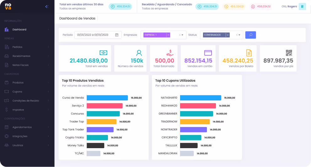 O Nova é a plataforma para controlar pedidos, notas de produtos e serviços, receber e gerenciar checkouts, vendas e finanças automaticamente